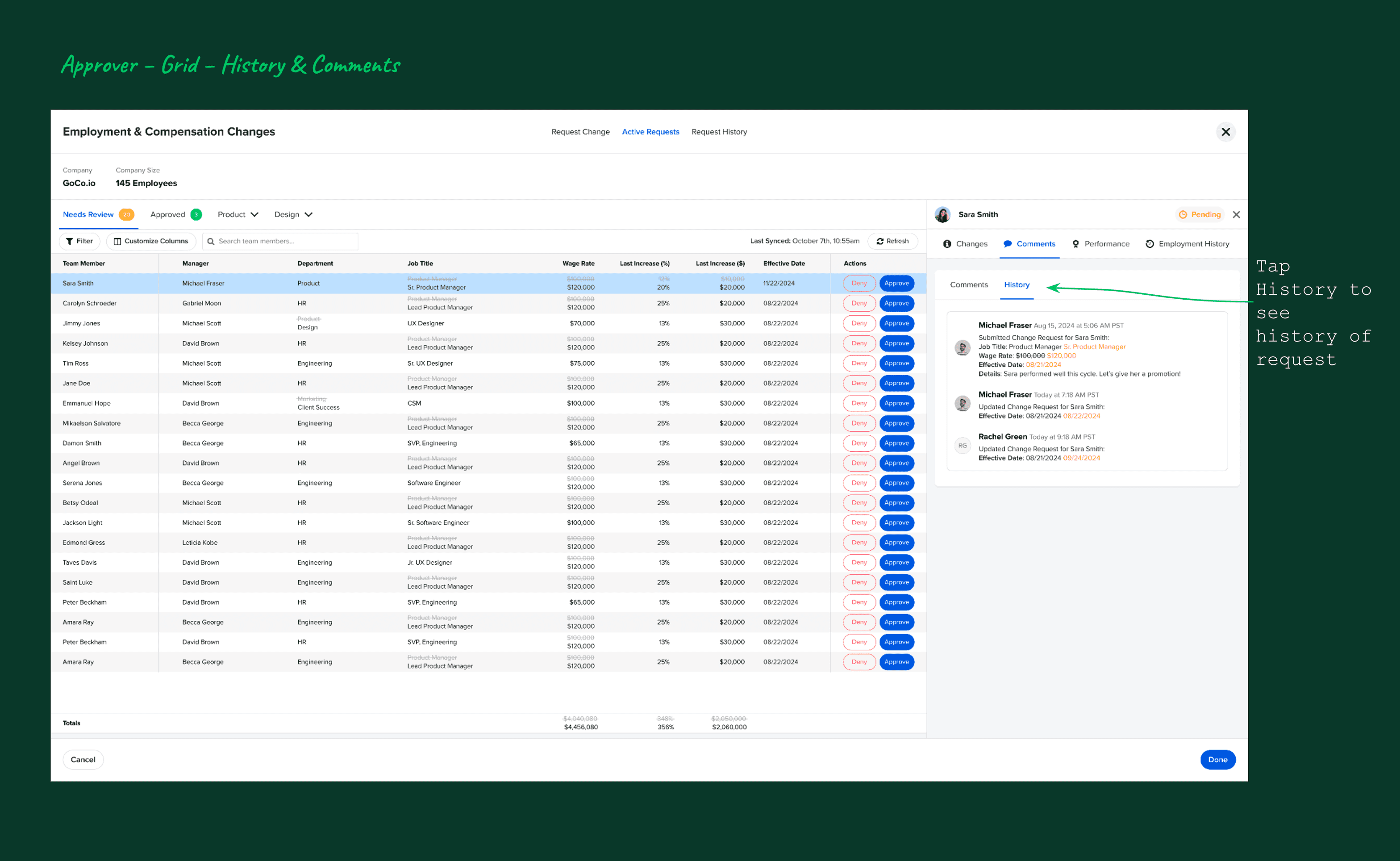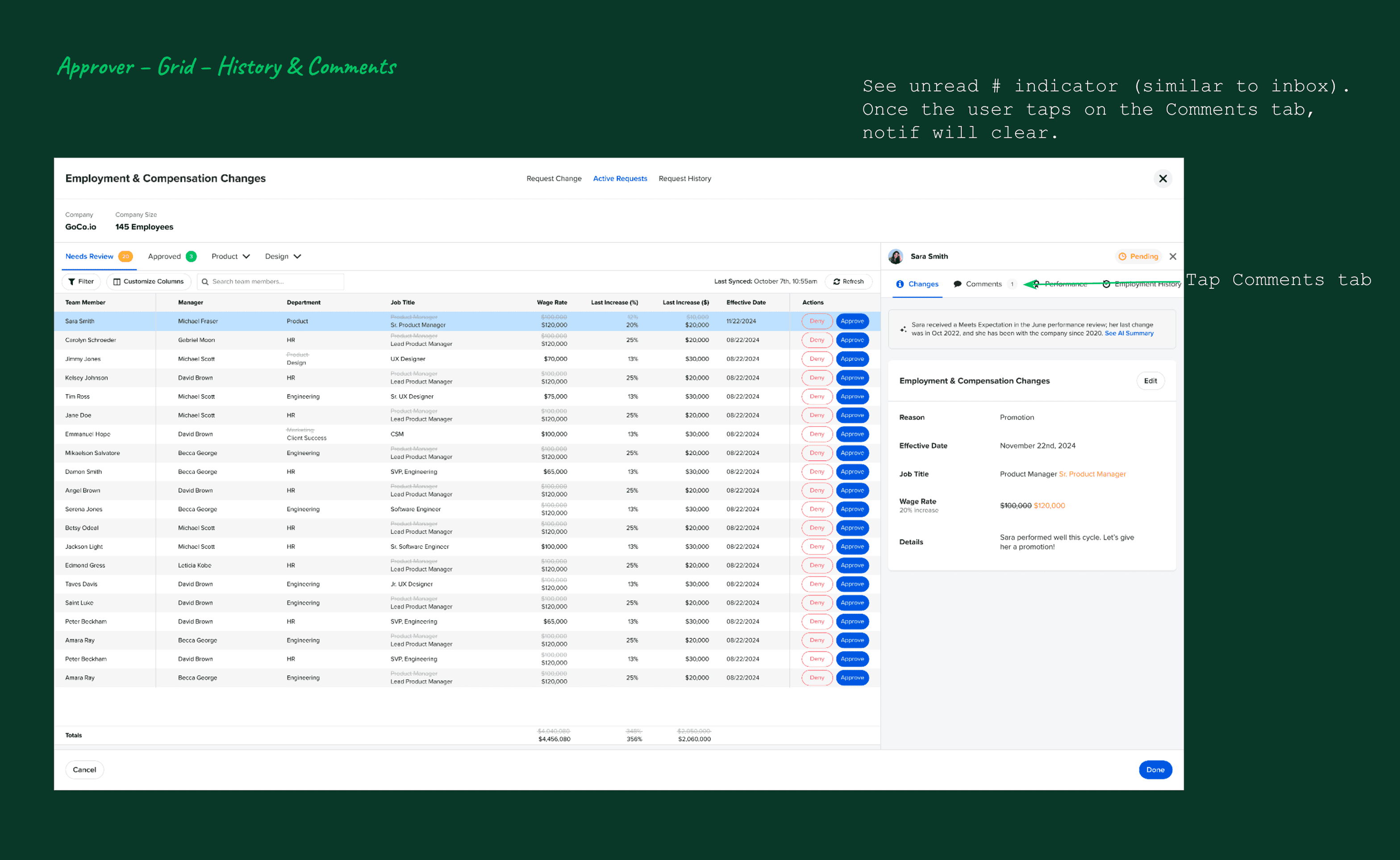 Approvers review proposed changes with full context, including comments and historical compensation data.