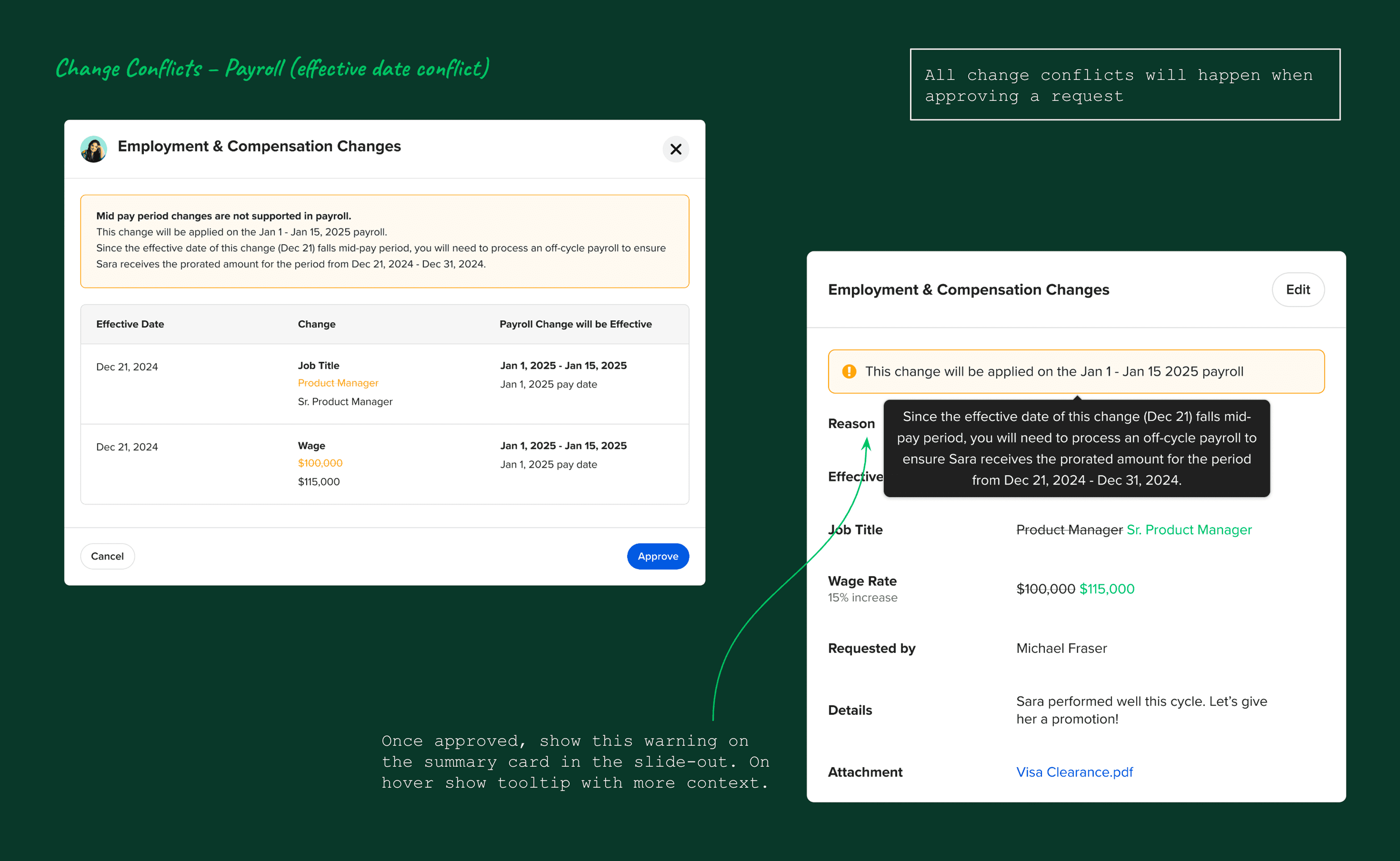Conflicting compensation changes are surfaced clearly, allowing admins to resolve issues before approval.