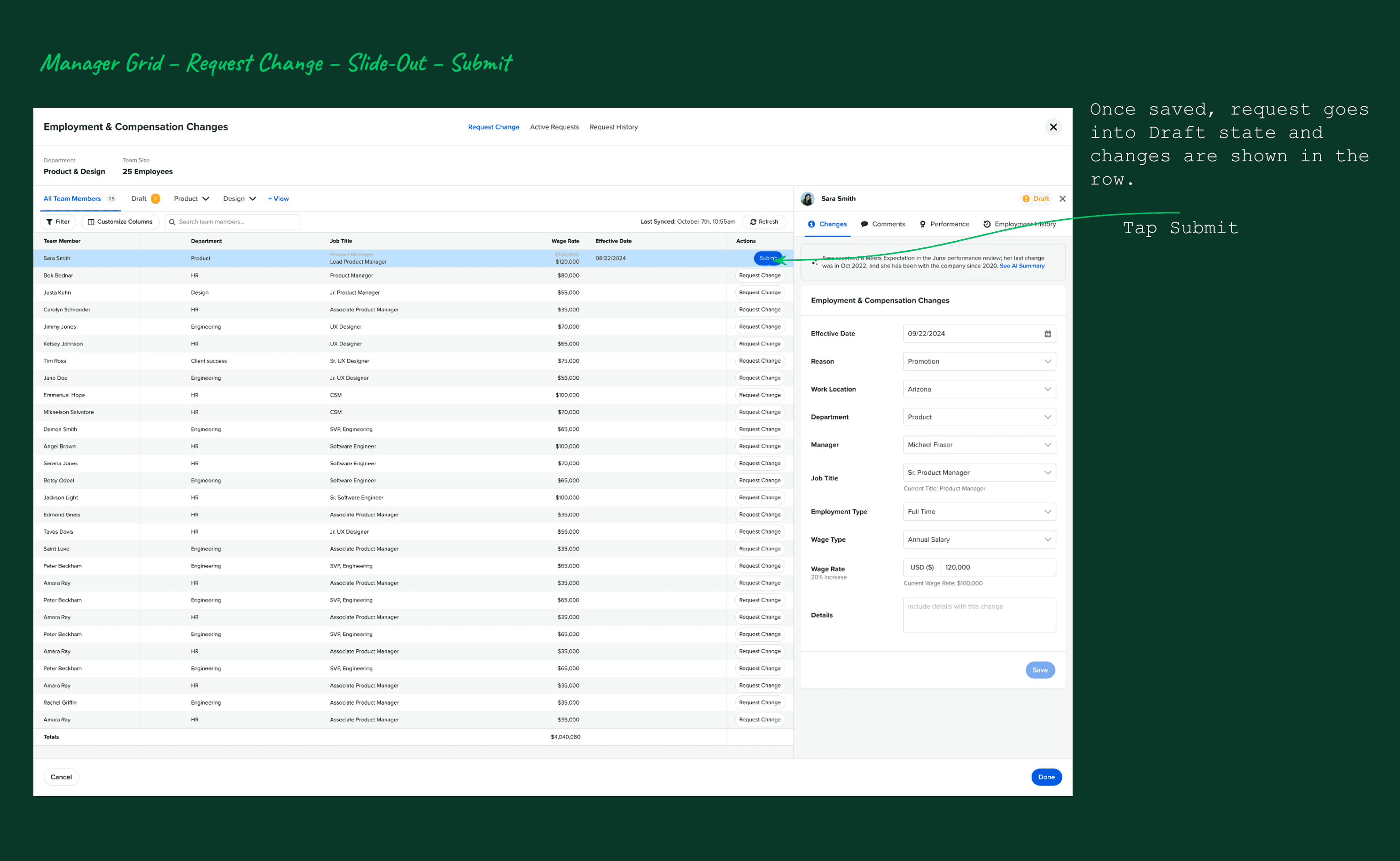 Managers can propose compensation updates without immediately finalizing them. Changes remain in a draft state until reviewed and submitted.