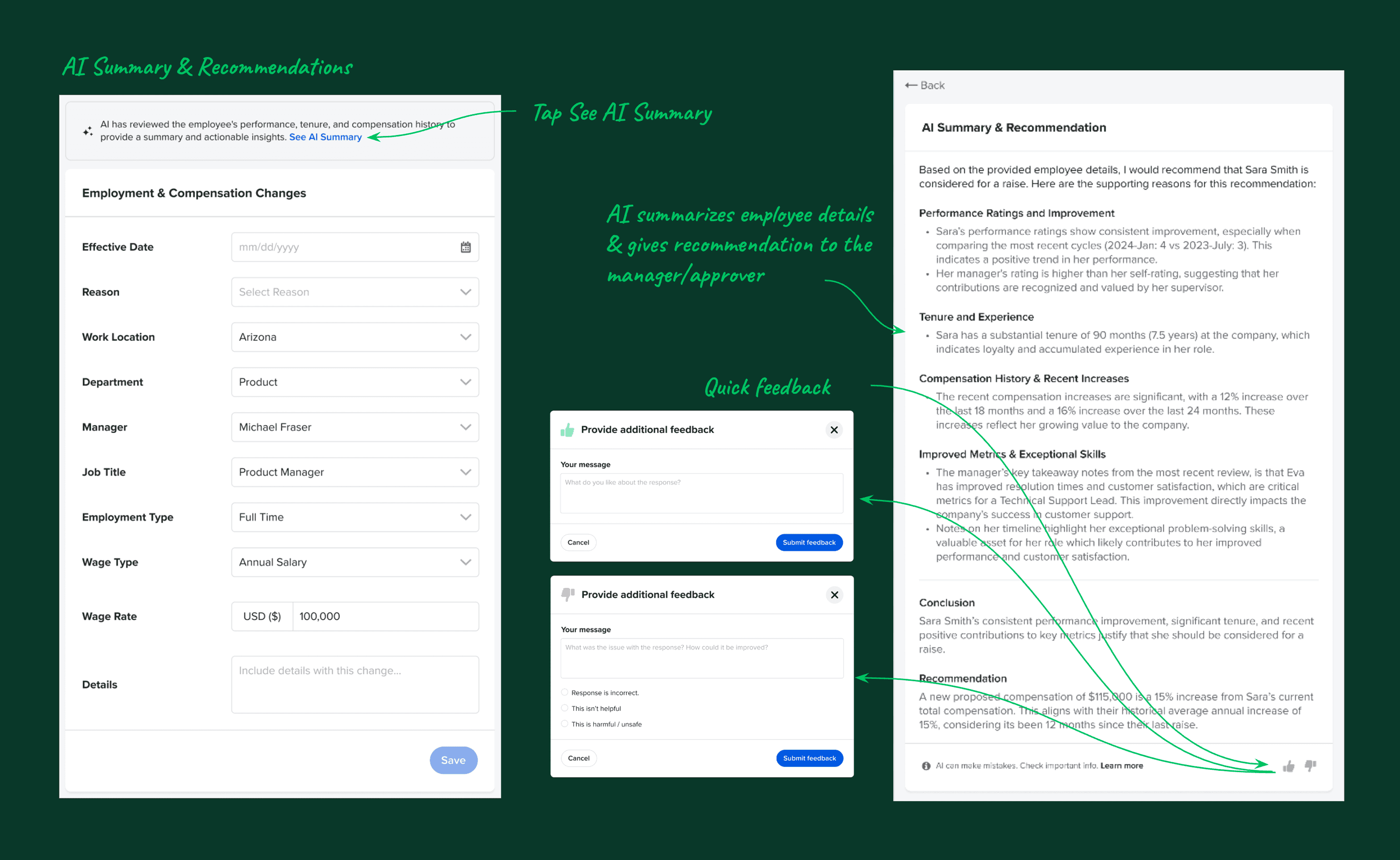 AI-generated summaries help approvers quickly understand compensation changes without removing human oversight.