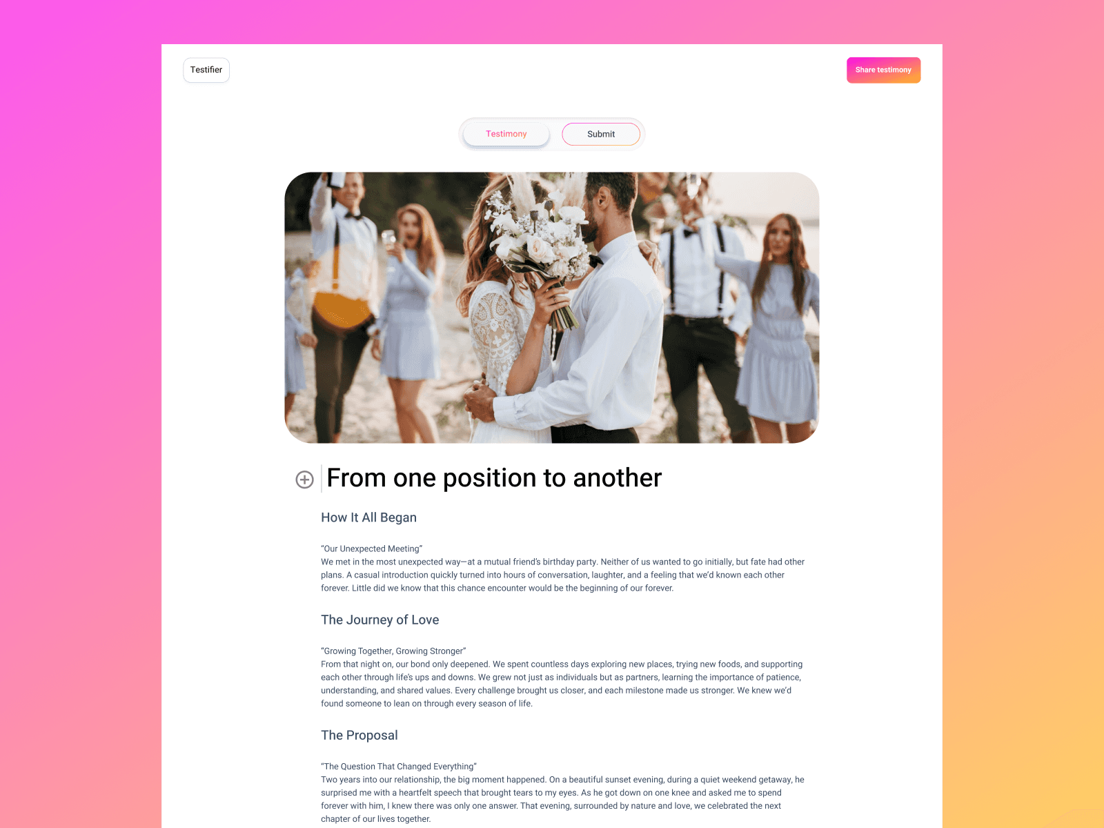 Testifier fills this gap by offering a welcoming, user-friendly platform where anyone can share their stories and access a rich collection of over 20,000 testimonies. The platform is designed to empower individuals, foster community, and create meaningful connections through shared experiences.